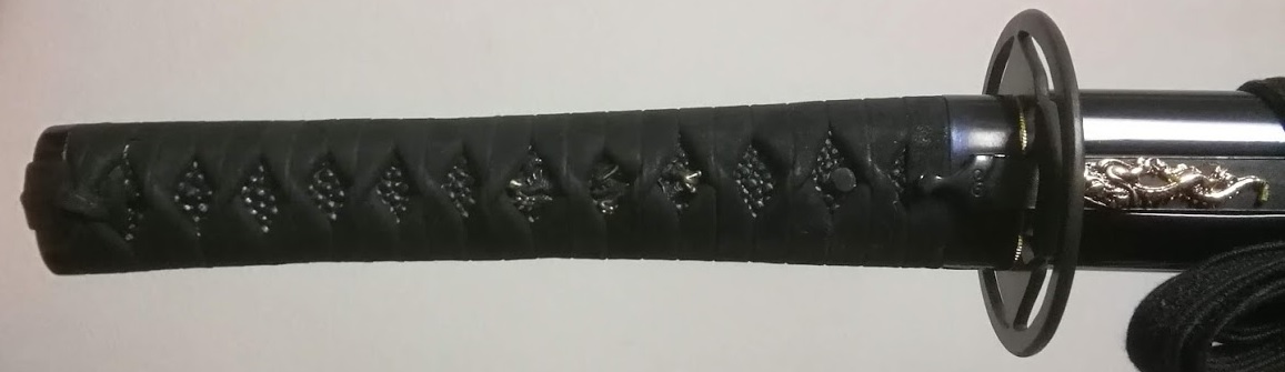 柄の寸法は本歌に合わせ約七寸八分、親粒入りの黒鮫皮に牛本革(バックスキン)の柄巻になっています。立鼓の効いた柄成りです。