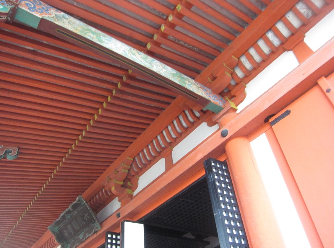 建物の外側部分、傷みやすい木材にそのまま朱塗がなされています。