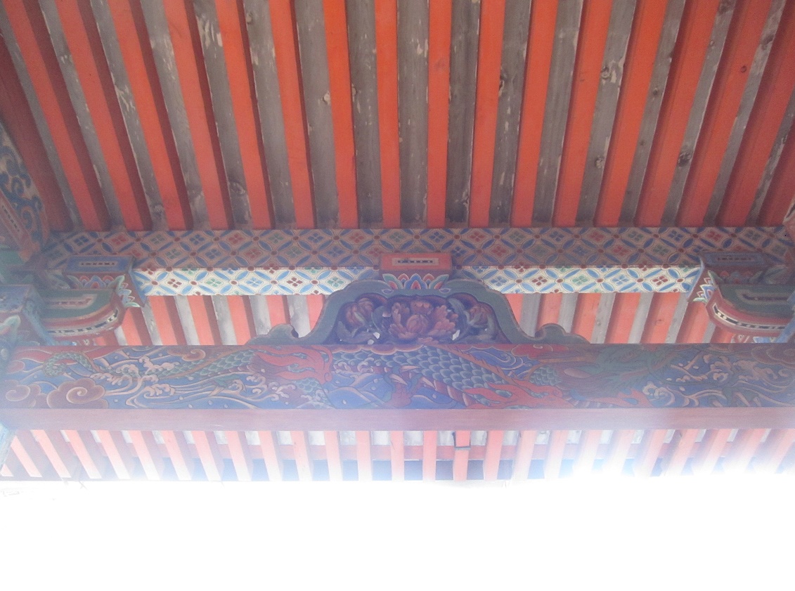 建築史家ではありませんので、外陣・内陣の隅々を確認できませんが、建物の内部に残存している彩色から、そして同時代の装飾を参照しながら、此等の模様・彩色は再現されたのだと推測します。