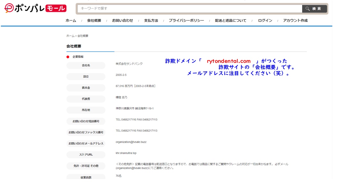 ひとつの詐欺ドメイン(詐欺ドメイン「 rytondental.com 」)から異なる社名とロゴを掲げる詐欺サイトが複数存在し、会社の所在地はみな違えども、何とメールアドレスは皆同じという、明らかに詐欺ヤロウの所行であることが明白になりました。残念ながら此奴(詐欺ドメイン「 rytondental.com 」)の注意力欠落のためにひとつだけ「会社概要」が無い詐欺サイトがありましたがね。