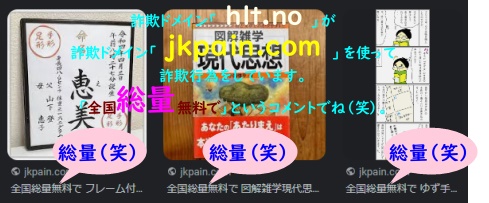 詐欺ドメイン「 jkpain.com 」は、阿呆コメント「全国総量無料で」を使ってましたわ。
