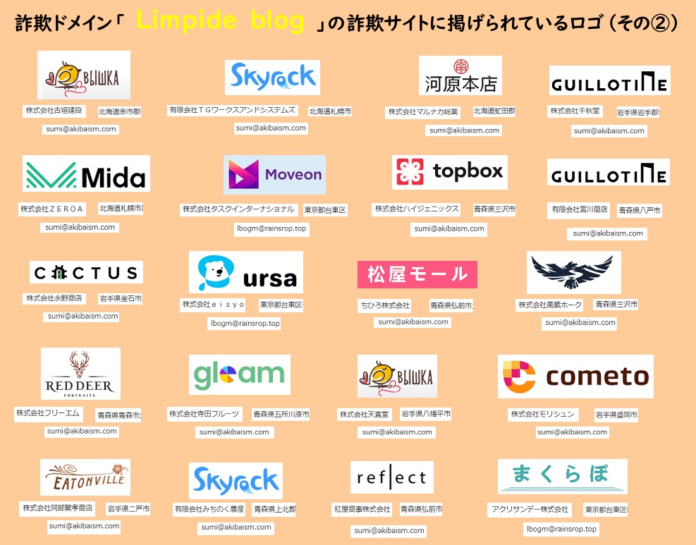 この2つめののロゴ一覧にも、同じロゴなのに社名・所在地・メールアドレスが異なっている事例が散見されまする。ねっ、阿呆でしょう(笑)。2つのロゴ一覧を見比べると、これまた同様の愚かな事例が複数あります。これが此奴(詐欺ドメイン「 hlt.no 」)の知能が低いと断定する根拠です。
