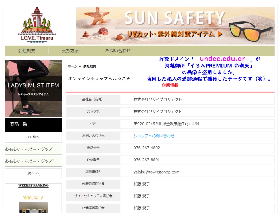 資本金5億5,000万円を誇る(笑)「埼玉・越谷の前田&本田」が、詐欺ドメイン「 undec.edu.ar 」で「河越御所」の帝釈天PREMIUMの画像を盗用した時の参考資料です。でも、もう此奴(埼玉・越谷の前田&本田)もネット上には居ません。消滅してしまいましたよ。被害に遭われた方々のお話は、未だヒットしますがね。