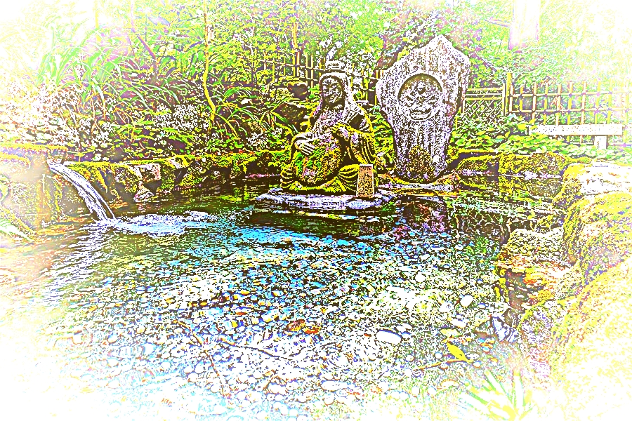 建物の中に安置されている木像かと思いきや、霊泉が湧き出る境内の弁天池に鎮座している石像ではありませんか。