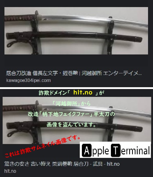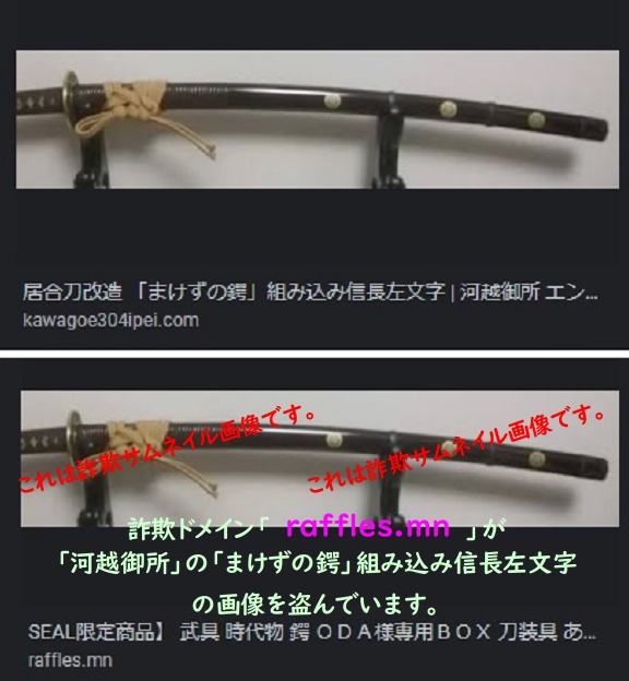ちょいと前のことになりますが、当御所の改造居合刀「まけずの鍔 組み込み信長左文字」の画像を盗用/乗っ取りした詐欺の族がおりました。詐欺ドメイン「 raffles.mn 」という不埒な族です。