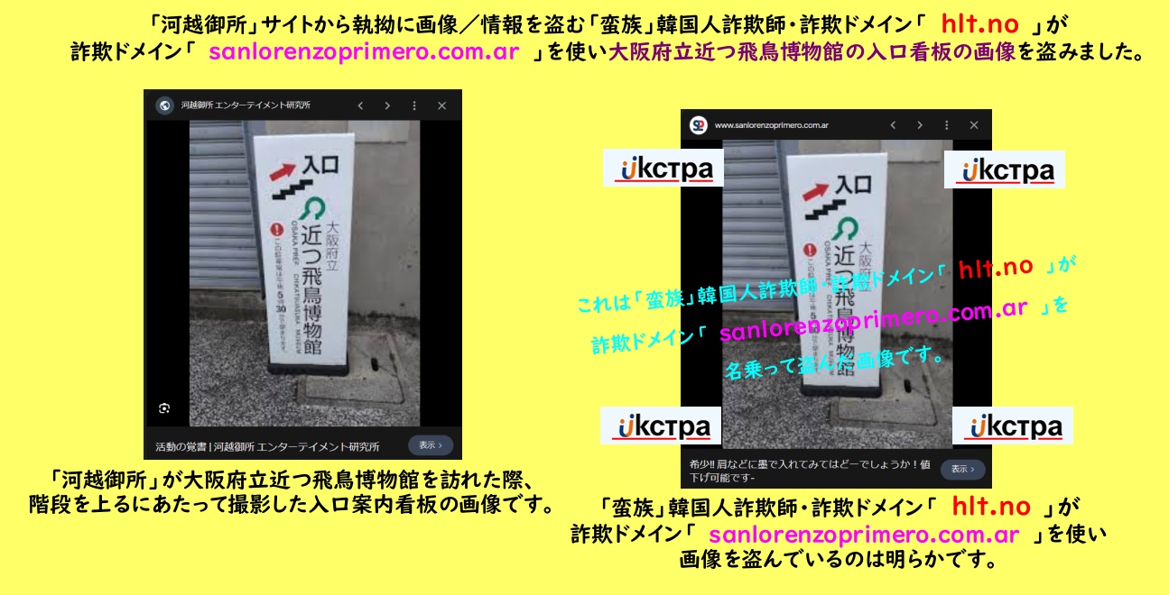 その時の様子は「活動の覚書」に掲載したのですが、四天王寺模型の画像と、入口看板の画像を「蛮族」韓国人詐欺師・詐欺ドメイン「 hlt.no 」が盗みました。