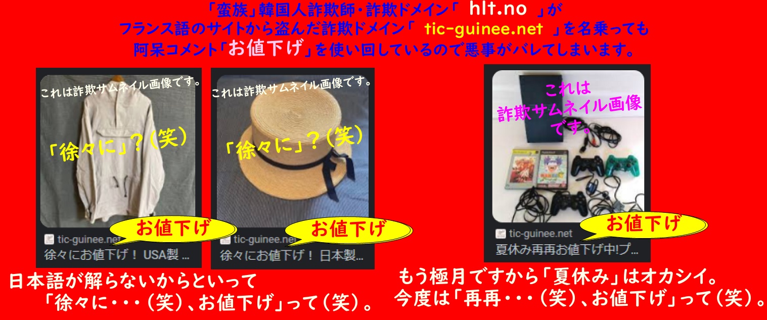 そして、フランス語のサイト/ドメインを乗っ取って攪乱しようとしたらしいのですが、「河越御所」から画像/情報を盗んだこと、そして阿呆コメント「お値下げ」を使っている為、「蛮族」韓国人詐欺師・詐欺ドメイン「 hlt.no 」の仕業と断定できるのです。