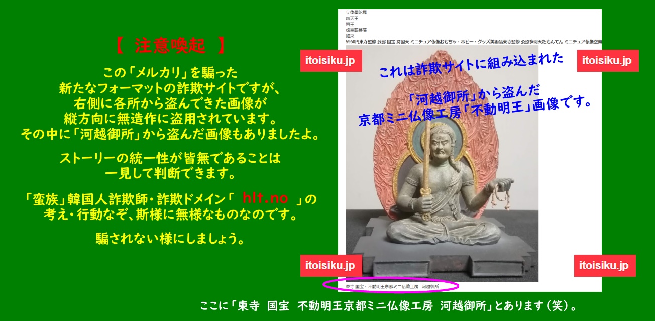 「河越御所」トップ・ページの整理作業をしているのですが、「蛮族」韓国人詐欺師・詐欺ドメイン「 hlt.no 」が詐欺ドメインを変えながら執拗に「河越御所」へと絡んでくる様子を世間の皆様に知っていただこうと、京都ミニ仏像工房「不動明王」の画像を事例に詐欺「征伐」を展開しておりました。