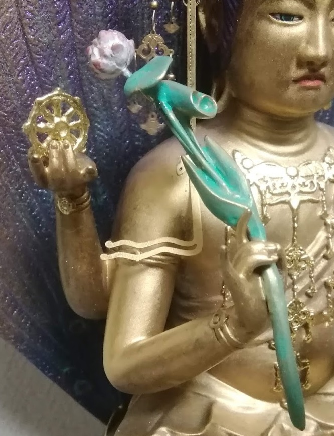 第二の右手にある「輪宝」は、観察すると明王の身体の金色とは異なる金色になっています。