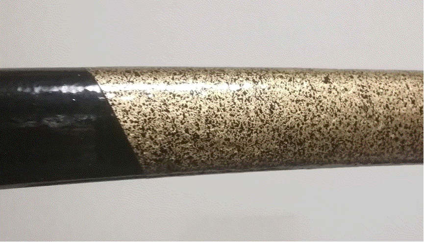この特注では鞘の切り返しで金色の部分を工夫しました。既存美術刀に用いられている少々複雑な鞘塗りに色替えしていただきました。
