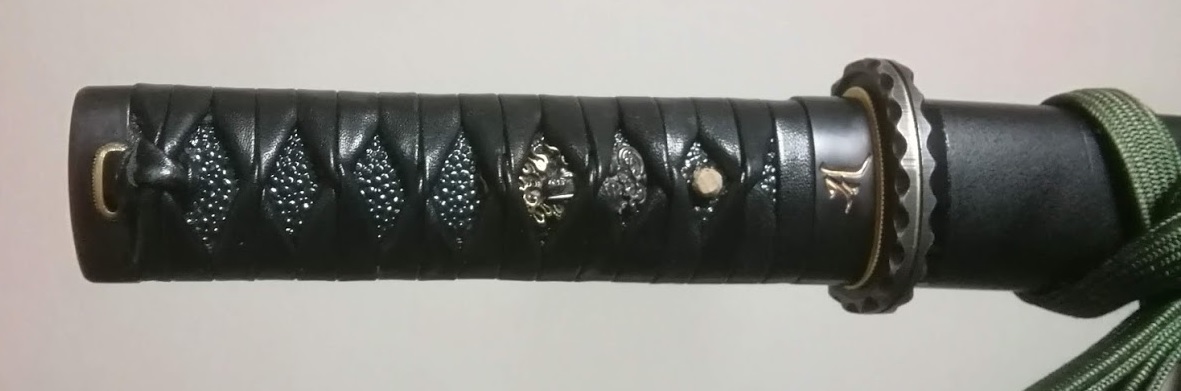 柄前の表側の様子です。柄巻は黒牛本革(表)に巻き替えました。