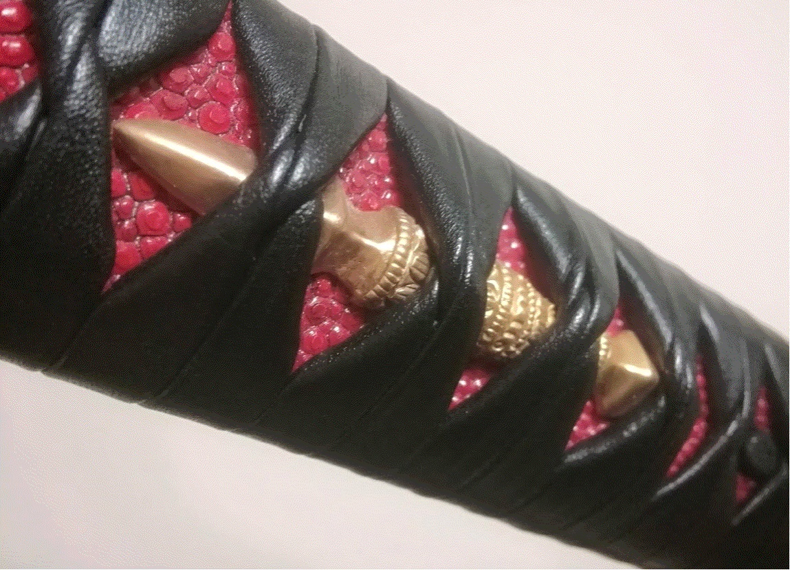 この長脇差の特徴は、目貫に法具「独鈷杵」を装着しているところにあります。市販目貫の独鈷杵では、この〝厳つい〟長脇差に不相応であるとして「武装商店」・店主様に相談したところ、カウンターの奥から「こんなのあるんですけど・・・」と素晴らしいアイテムを出していただきました。法具としては小さめの、目貫としては大きめの「独鈷杵」。店主様は「何かあったら使おうと思って・・・」と仰っておられましたが、〝我が特注こそ何か〟だったので投入していただきました。