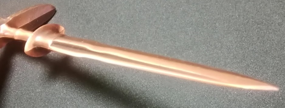 出土した有柄銅剣の3分の1のサイズではありますが、造形は本物に忠実な再現となっており素晴らしい物です。小さいながら、これほど出来映えが良い物を手にしてしまうと、〝原寸大〟が欲しくなってしまいます。