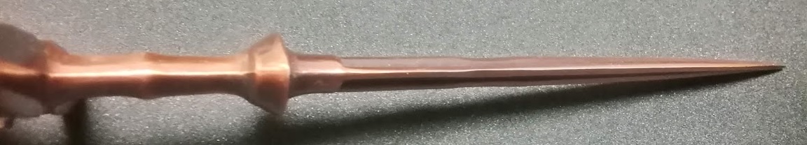 刃部と握りの間に鍔のような造形が備えており、柄には握りやすいように出っ張りが見えます。柄頭に相当する箇所には横に平らなパーツを組み合わせ、柄頭で挟んでいるようです。これはパーツ組み合わせではなく、一体化している造形だそうです。