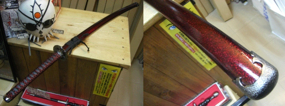 納品連絡を受け、店頭での確認の際に、柄下地合皮の色を「茶色」(赤っぽく見えますが)と指定していた物が「黒」だったので注文依頼を見直していただいたところ〝色の指定違い〟であったことが判明、発注をしなおしていただきました。黒合皮の商品紹介で他に「茶色もできる」ということでしたので、〝茶色合皮がどの様な感じ〟かを試してみることと赤系色にまとめた特注としようという意図があったため、店主様・美術刀担当者様に「造り直してもらえます?」と頼んでみたら快諾していただきました。いつもであればチョット違っていても購入してしまうのですけれどね。ちなみに黒合皮の方は、間もなく買い手がついたとのことでした。良かった、良かった。