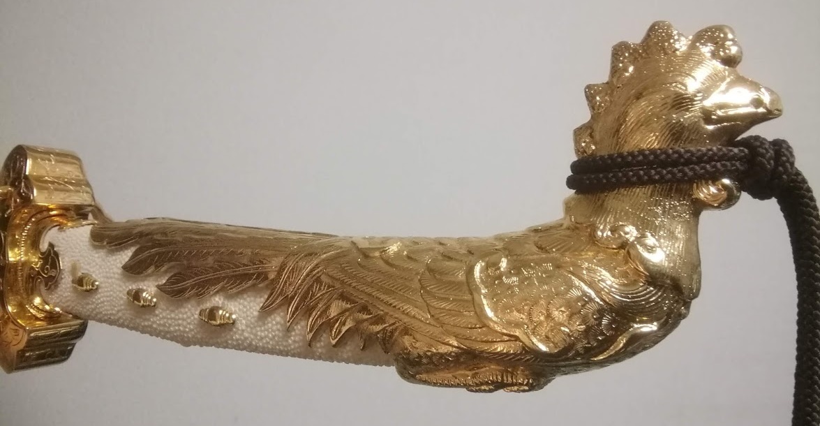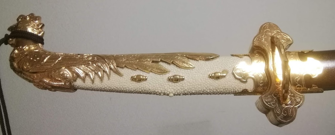 那須乃木神社の公式認定「乃木大将の儀礼刀」、東郷神社の創建五十周年記念「東郷元帥の指揮刀」を監修された研師の故・山田研山氏の手による商品名「鳳凰の飾剣」で、受注生産だったことから流通数は少数のため、なかなかお目に掛かることは無い様です。