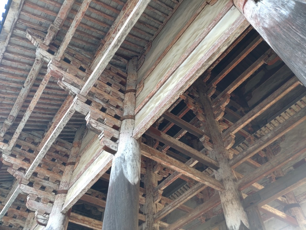 沢山の瓦が載っている重たい屋根、そしてその屋根を支える柱と木組み。